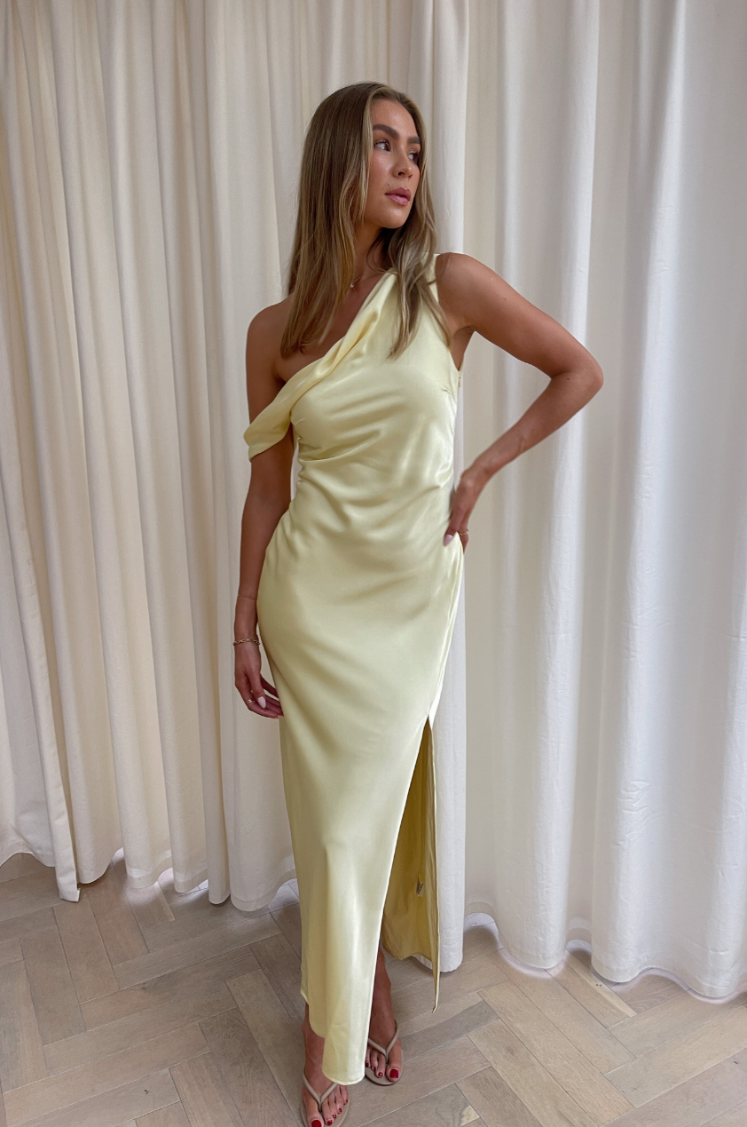 The Gia Maxi dress features a beautifully draped asymmetrical neckline and side split for an effortless ethereal look.